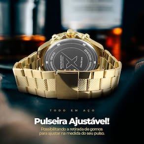 Relogio Masculino Dourado + Corrente Inoxidável Casual Kit de Presente Orizom Spaceman X - Relógio Masculino Dourado + Corrente Grumet Dourada + Pingente Cruz + Óculos Masculino Orizom Spaceman - Relógio Masculino Orizom Spaceman X: Surpreenda com estilo e elegância! O relógio analógico Orizom Spaceman X é banhado a ouro dourado e possui um mostrador preto, garantindo um visual sofisticado e moderno. Além disso, a tampa é blindada com arte exclusiva Orizom Spaceman X, tornando-o um presente único e autêntico.