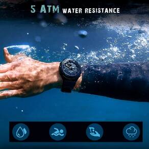Especificações: [Durabilidade inigualável]: Mergulhe sem preocupações até 50 metros graças à resistência superior à água e ao vidro Hardlex que protege o visor contra arranhões e impactos, mantendo-o sempre impecável.[Estilo versátil]: O design esportivo com mostrador redondo em liga de alta qualidade e a confortável pulseira de silicone tornam este relógio um acessório versátil e elegante, adequado tanto para festas sofisticadas quanto para atividades ao ar livre.[Funcionalidades avançadas]: Equipado com luz de fundo, alarme e múltiplos fusos horários, este relógio é perfeito para os viajantes globais que necessitam de informações precisas em qualquer parte do mundo.[Desempenho contínuo]: Alimentado por uma bateria duradoura, você pode confiar no movimento quartzo-digital deste relógio para uma cronometragem eficaz, quer esteja numa reunião de negócios ou a fazer exercícios intensos.[Precisão nos detalhes]: Com um mostrador de diâmetro entre 40 e 44 mm e uma banda ajustável de 24 cm, este relógio foi minuciosamente desenvolvido para se ajustar perfeitamente ao seu pulso, oferecendo o máximo conforto e precisão.