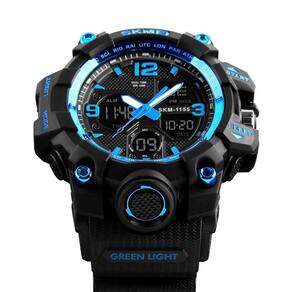 Relógio Masculino Esportivo Digital Skmei 1155 Prova D'água Cor: Azul Relógio Masculino Esportivo Digital Analógico Militar Exercito Skmei 1155B AnaDigi Grande LED Características: Marca: Skmei Modelo: 1155B Categoria: AnaDigi Analógico: Sim Ponteiros Fluorescentes: Sim Digital: Sim Formato da hora: 12/24 Despertador: Sim Bip de hora em hora: Sim Calendário: Sim Mostra o Dia da Semana: Sim Mostra o Dia do Mês: Sim Cronômetro: Sim Cronômetro Regressivo timer : Não Luz: Sim Cor da Iluminação: Verde Resistente à Água: 5BAR/5ATM/50M Pode ser Utilizado para nadar no raso, por pouco tempo submerso - Respingos: Sim - Chuva: Sim - Lavar Louça: Sim - Natação: Sim - Mergulho: Não Característica do Vidro: Resina Tipo de Fecho: Fivela Dupla Material da Caixa: Plástico Material da Pulseira: Borracha Formato da Caixa: Redondo Diâmetro da Caixa: 55 mm Espessura da Caixa: 17 mm Largura da Pulseira: 22 mm Comprimento da pulseira: 235 mm Ajustável Alimentação: Bateria Peso Líquido: 72g : 03 Meses Conteúdo da Embalagem: - Relógio - Estojo do relógio -