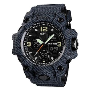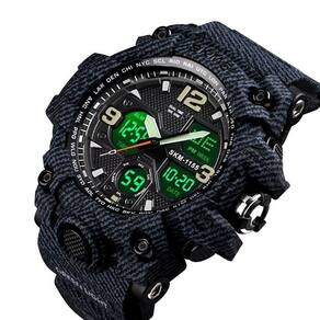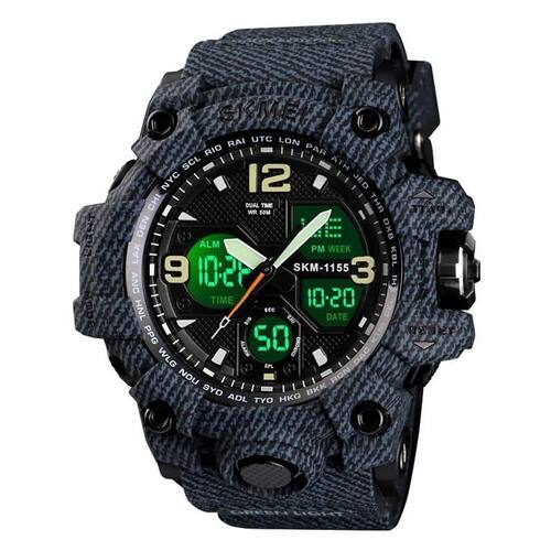 Relógio Masculino Esportivo Digital Skmei 1155 Prova D'água Cor: Jeans Preto Relógio Masculino Esportivo Digital Analógico Militar Exercito Skmei 1155B AnaDigi Grande LED Características: Marca: Skmei Modelo: 1155B Categoria: AnaDigi Analógico: Sim Ponteiros Fluorescentes: Sim Digital: Sim Formato da hora: 12/24 Despertador: Sim Bip de hora em hora: Sim Calendário: Sim Mostra o Dia da Semana: Sim Mostra o Dia do Mês: Sim Cronômetro: Sim Cronômetro Regressivo timer : Não Luz: Sim Cor da Iluminação: Verde Resistente à Água: 5BAR/5ATM/50M Pode ser Utilizado para nadar no raso, por pouco tempo submerso - Respingos: Sim - Chuva: Sim - Lavar Louça: Sim - Natação: Sim - Mergulho: Não Característica do Vidro: Resina Tipo de Fecho: Fivela Dupla Material da Caixa: Plástico Material da Pulseira: Borracha Formato da Caixa: Redondo Diâmetro da Caixa: 55 mm Espessura da Caixa: 17 mm Largura da Pulseira: 22 mm Comprimento da pulseira: 235 mm Ajustável Alimentação: Bateria Peso Líquido: 72g : 03 Meses Conteúdo da Embalagem: - Relógio - Estojo do relógio -