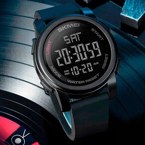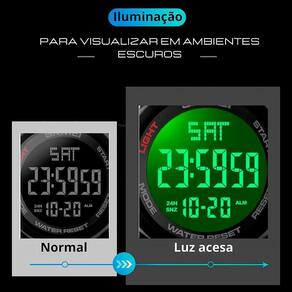 Relógio Masculino Esportivo Com Resistencia Água 5Atm - Preto Está procurando um relógio Você acabou de encontrar Descrição detalhada: - marca: skmei - modelo: 1257 - gênero: masculino - categoria: digital - especificações: este relógio possui luz de fundo, cronômetro, alarme, resistente a choques, calendário, fuso horário múltiplo, 12/24 horas, contagem regressiva, resistente à água 50 metros, material da pulseira de silicone e pulseira com fecho de fivela. - relógio disponível em . - : 90 dias, do vendedor Tamanho e peso: - comprimento da pulseira: aproximadamente 24 cm - diâmetro da caixa: aproximadamente 5 cm - dial espessura: aproximadamente 1.5 cm - largura da pulseira: aproximadamente 2.2 cm - peso: 63g Informações importantes: - pode ser ao lavar louças, nadar, praticar esportes em águas rasas ou na chuva, mas não para mergulho com snorkel ou tanque de oxigênio. - uma observação importante é que não se deve tomar banho de água quente utilizando seu relógio mesmo que ele seja à prova d'água. Nenhum relógio, mesmo a prova d'água, deve ser submetido ao contato com água muito quente. A água não é prejudicial ao seu relógio, mas sim a temperatura da água. Temperaturas mais elevadas dilatam os materiais e podem comprometer a vedação do seu relógio provocando aberturas para entrada de água. O mesmo problema ocorre com o uso de relógios em saunas. Não é o vapor que prejudica a vedação, mas a temperatura do vapor, ou seja, mesmo que o vidro não fique embaçado, altas temperaturas podem danificar os mecanismos internos do seu relógio. - cuidados com a mudança brusca de temperatura: cuidado ao colocar o relógio em contato com a água muito gelada, como por exemplo, colocar o relógio em caixa de isopor com gelo quando for pegar alguma bebida, pois essa mudança brusca de temperatura pode causar choque térmico no relógio, fazendo o relógio ficar com o vidro suado. - não é recomendado apertar os botões do relógio quando ele estiver submerso, tais práticas são consideradas como mau uso e nossa não cobre defeito por mau uso. - mesmo o melhor relógio à prova d'água para mergulho não está livre dos efeitos da água salgada, que pode oxidar partes metálicas e diminuir a durabilidade de materiais sintéticos ou plásticos. Por isso, após o mergulho, se o relógio tiver contato com água salgada ou de piscina, enxague com água corrente para remover qualquer resíduo de sal ou cloro. Sobre a reposição da pilha/bateria: - quando se instala uma pilha nova, o relógio deverá funcionar por aproximadamente de 1 a 2 anos em condições normais de uso . - a pilha do seu relógio poderá esgotar-se antes de 1 a 2 anos após a compra, por se tratar de uma pilha monitora, instalada pela fábrica a fim de verificar todo o funcionamento do relógio. Troque a pilha quando o relógio parar de funcionar. - a dos relógios é para defeitos de fabricação do relógio. As pilhas são terceirizadas e a não cobre. Receba o produto que está esperando ou devolvemos o seu dinheiro de volta