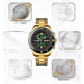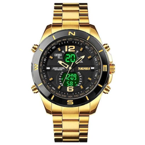 Relógio Masculino Esportivo Skmei 1670 AnaDigi Luxo Cor: Dourado Relógio Masculino Esportivo Skmei 1670 AnaDigi Luxo Se você deseja usar um relógio de luxo super especial e atraente para seus melhores momentos. Este relógio é um relógio de pulso de moda masculina que além de ser lindo tem funções múltiplas, que inclui alarme, data, semana, cronômetro, luz de fundo LED e exibição de 12/24 horas. Se você gosta de estar atraente e sempre na moda, esse relógio é sua melhor escolha Características: Marca: Skmei ógico: Sim Digital: Sim Mostra o dia da semana: Sim Mostra o dia do mês: Sim Despertador: Sim Cronômetro: Sim Luz: Sim Resistente à água: Sim 3ATM - Respingos: Sim - Chuva: Sim - Lavar o carro: Sim - Natação: Não - Mergulho: Não Tipo de feche: Dobrável com Botão Material da caixa: Metal Alloy Material da pulseira: Aço Inoxidável Característica do vidro: Cristal Mineral Espessura da caixa: 16mm Diâmetro da caixa: 48mm Comprimento Máximo: 24cm Largura da pulseira: 20mm Peso líquido: 150g. Alimentação: Bateria Modelo: 1670 Marca: Não Informado