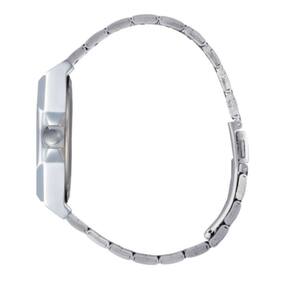 A pulseira de aço inoxidável prateada é ajustável e resistente, sendo ideal para diversas ocasiões, desde compromissos casuais até eventos sociais mais formais.