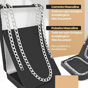 Para complementar o look, o kit inclui um colar Grumet em aço inox, com aproximadamente 65 cm de comprimento, e uma pulseira em aço inoxidável no mesmo estilo Grumet do colar, com cerca de 25 cm, criando um conjunto moderno e elegante.