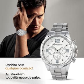 - Material do Maquinário e Pulseira do Relógio: Aço Inox Prata