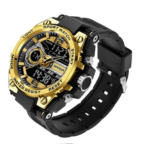 - ?Multifunções: 1. Mostrador duplo analógico e digital suporta dois fusos horários diferentes 2. Alarme 3. Luz traseira de LED (mostra a hora clara no escuro) 4. Data 5. Cronômetro 6. Opção de formato 12/24H 7. Resistente a impactos. Essas funções o tornam perfeito para todos os tipos de esportes e uso diário