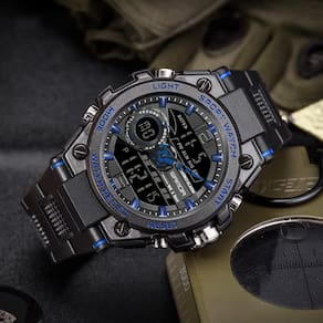 - ?Multifunções: 1. Mostrador duplo analógico e digital suporta dois fusos horários diferentes 2. Alarme 3. Luz traseira de LED (mostra a hora clara no escuro) 4. Data 5. Cronômetro 6. Opção de formato 12/24H 7. Resistente a impactos. Essas funções o tornam perfeito para todos os tipos de esportes e uso diário