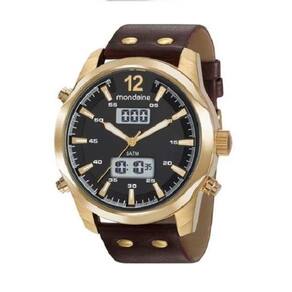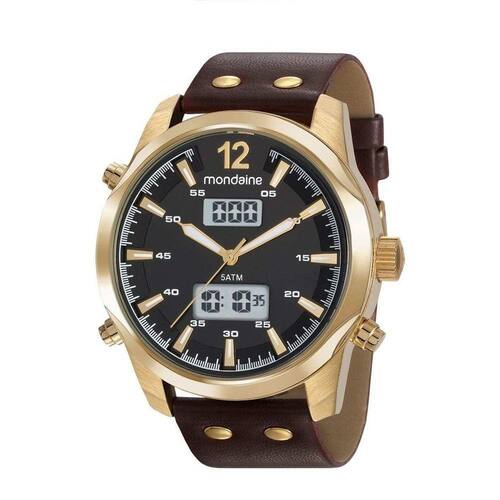 Super sofisticado, este relógio contém pulseira material sintético marrom com acabamento acetinado e pespontos brancos, caixa de metal dourado e visor preto com marcadores dourado. Seu design oferece o caimento ideal para pulsos largos. Além disso, é um relógio com função analógica digital, possibilitando duas formas de visualizar as horas.