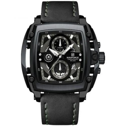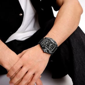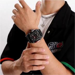 Especificações [Design e Estilo] Este relógio esbanja elegância e modernidade com seu formato tonneau e visor de hardlex resistente. Incorporando elementos da moda casual, está disponível com um mostrador de diâmetro entre 45mm e 49mm. [Funcionalidades Supremas] Equipado com cronômetro, alarme e calendário completo, além de mãos luminosas, assegura que você nunca perca um segundo de suas atividades, dia ou noite. [Durabilidade e Conforto] Sua pulseira de mede 26cm de comprimento e entre 15mm e 19mm de largura, garantindo ajuste perfeito e conforto sem igual seja qual for o tamanho do seu pulso. [Desempenho Resiliente] Conta com resistência à água de até 3 Bar e é construído com material de liga, assegurando que está preparado para enfrentar qualquer condição e se manter funcional. [Precisão de Movimento] Operando com um mecanismo Quartz, este relógio precisão de tempo com confiabilidade, ideal para homens que buscam desempenhos exatos em suas vidas agitadas.