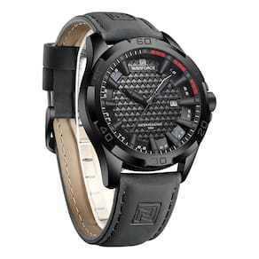 Sua pulseira em couro preto de alta qualidade oferece conforto e durabilidade, enquanto a caixa em aço inoxidável e o cristal mineral resistente garantem proteção e elegância. O visor analógico com mostrador preto e detalhes escuros reforça o visual masculino, discreto e moderno.