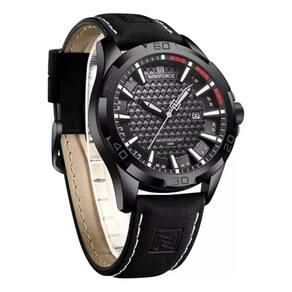 Sua pulseira em couro preto de alta qualidade oferece conforto e durabilidade, enquanto a caixa em aço inoxidável e o cristal mineral resistente garantem proteção e elegância. O visor analógico com mostrador preto e detalhes escuros reforça o visual masculino, discreto e moderno.