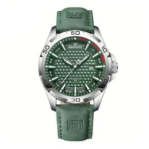 Sua pulseira em couro verde de alta qualidade oferece conforto e durabilidade, enquanto a caixa em aço inoxidável e o cristal mineral resistente garantem proteção e elegância. O visor analógico com mostrador verde e detalhes reforça o visual masculino, discreto e moderno.