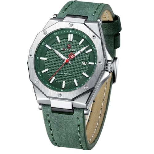 Relógio masculino naviforce pulseira couro nf9200 verde Relógio masculino naviforce pulseira couro verde nf9200 Relógio de pulso masculino em aço inox de quartzo a prova dagua acabamento de luxo qualidade inigualável Impermeável 30 metros: pode suportar o respingo de água e chuva, adequado para uso diário. Tipo material de janela do mostrador: a janela do mostrador é feita de vidro mineral, que é um cristal mineral resistente a riscos e durável.