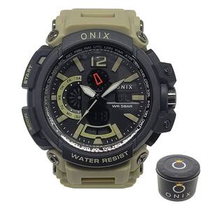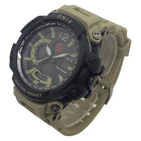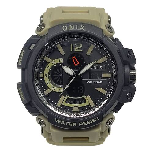 Relógio Masculino Onix AnaDigi OX124 Bege e PretoMarca: Onix Categoria: AnaDigi Analógico: Sim (1 Horário) Ponteiros Fluorescentes: Sim Digital: Sim (1 Horário) Calendário: Sim Despertador: Sim Mostra o Dia da Semana: Sim Mostra o Dia do Mês: Não Cronômetro: Não Contador Regressivo: Não Luz: Sim Cor da Iluminação: VerdeResistente à Água: 5 ATM (Pode ser utilizado para nadar no raso, por pouco tempo submerso) - Respingos: Sim - Chuva: Sim - Lavar Carro: Sim - Lavar Louça: Sim - Natação: Sim - Mergulho: Não Característica do Vidro: Acrílico Tipo de Fecho: Fivela Cor da Caixa: Preto Material da Caixa: Plástico Formato da Caixa: Redondo Diâmetro da Caixa: 56,00 (mm) Espessura da Caixa: 18,00 (mm) Cor da Pulseira: Bege Material da Pulseira: Plástico Largura da Pulseira: 21,50 (mm) Comprimento Máximo da Pulseira: 240,00 (mm) Alimentação: Bateria Interna Peso Líquido: 0,060 Kg Modelo: OX124 Cor Predominante: Bege Cor Diferencial: Preto Garantia: 12 MesesConteúdo da Embalagem: 01 Relógio 01 Embalagem 01 Termo de Garantia Ean: 7891368317021