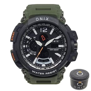 Relógio Masculino Onix AnaDigi OX124 Verde e Preto Relógio Masculino Onix AnaDigi OX124 Verde e Preto Marca: Onix Categoria: Calendário: Sim Despertador: Sim Mostra o Dia da Semana: Sim Mostra o Dia do Mês: Sim Cronômetro: Não Contador Regressivo: Não Luz: Sim Cor da Iluminação: Verde Resistente à Água: 5 ATM Pode ser para nadar no raso, por pouco tempo submerso - Respingos: Sim - Chuva: Sim - Lavar Carro: Sim - Lavar Louça: Sim - Natação: Sim - Mergulho: Não Característica do Vidro: Acrílico Tipo de Fecho: Fivela Cor da Caixa: Preto Material da Caixa: Plástico Formato da Caixa: Redondo Diâmetro da Caixa: NaN mm Espessura da Caixa: NaN mm Cor da Pulseira: Verde Material da Pulseira: Plástico Largura da Pulseira: 54,00 mm Comprimento Máximo da Pulseira: 18,50 mm Alimentação: Bateria Interna Peso Líquido: 0,057 Kg Modelo: OX124 Cor Predominante: Verde Cor Diferencial: Preto : 12 Meses Conteúdo da Embalagem: 01 Relógio 01 Embalagem 01 Termo de Marca: Não Informado