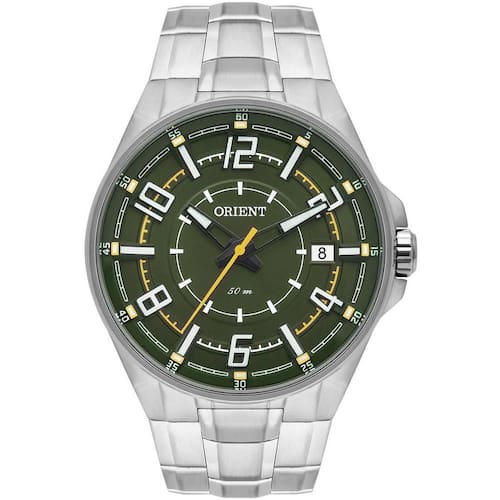 Relógio orient masculino ref: mbss1442 e2sx casual prateado Descrição do produto: Vidro: cristal mineral Funções: calendario, analógico Resistencia à água: 50 m Características: com caixa aço inoxidável e pulseira aço inoxidável Diâmetro da caixa: 4,5 cm Alimentação do maquinário: bateria Mostrador verde militar com números e detalhes em amarelo Fundo rosqueado Garantia de 1 ano
