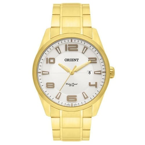 Informações do produto Relógio Masculino Orient MGSS1131 S2KX Caixa: Aço Dourado Pulseira: Aço Dourado Mostrador: Prateado Função: Calendário Resistência: 5 ATM Visor em Cristal Mineral Movimento Quartz Tamanho da Caixa: 44 mm Espessura da Caixa: 10 mm Tamanho da Pulseira: 21 cm Fecho dobrável Estado: Novo Acompanha caixa e manual. Ean: 7891529118634