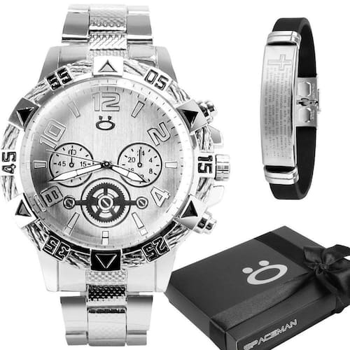 Relógio masculino prata aço inox + pulseira pai nosso + caixa presente analogico casual robusto Kit Luxo Masculino - Relógio em Aço Inoxidável, Pulseira e Caixa Premium Orizom Spaceman