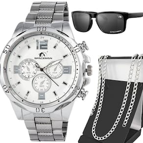 Relógio Masculino Prata Aço Inoxidável + Cordão + Óculos Sol Social Grumet Inoxidável Proteção UV Kit Masculino Orizom Spaceman - Relógio, Óculos de Sol e Cordão Grumet