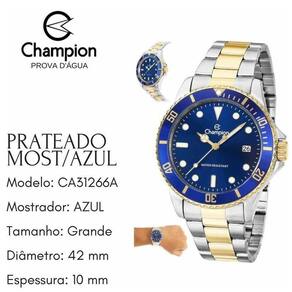 Marca: Champion Modelo: CA31266A Formato da Caixa: Redondo Gênero: Masculino Cor do Mostrador: Azul Material da Pulseira: Aço Mecanismo: Analógico Pulseira Ajustável: Sim Material da Caixa: Aço Material do Vidro: Cristal Mineral Nível de Resistência à Água: 5 ATM Calendário: Sim