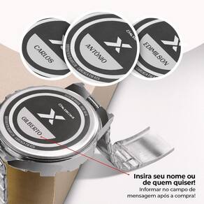 O relógio apresenta um formato redondo, todo prateado e feito em aço inoxidável. Com mostrador preto, criando um contraste elegante e moderno, e detalhes internos únicos que tornam cada peça especial. Além disso, o relógio é personalizável, permitindo que você insira seu nome ou o nome de quem deseja presentear, tornando-o ainda mais especial.