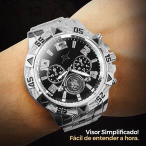 - 1 Relógio Analógico Masculino Orizom Spaceman X: formato redondo, todo prateado, feito em aço inoxidável, mostrador preto (ou azul), com arte detalhada na tampa.