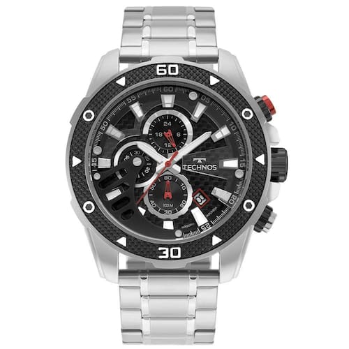 Relógio masculino Technos Carbon é um modelo robusto com estilo esportivo. Com pulseira e caixa de aço, ele possui aro giratório com textura em alto relevo e cronógrafo. Seu mostrador apresenta duas camadas, dando um efeito de profundidade na peça, e detalhes com aplicação de Fibra de Carbono. Possui tamanho de caixa 50mm e resistência à água de até 10 ATM.