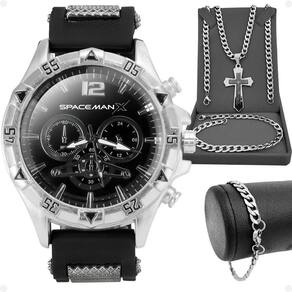 Relogio Masculino Prateado + Cordão Prata Grumet + Pulseira Presente Inoxidável Crucifixo Ajustavel Kit Especial Orizom Spaceman X para Presentear Quem Você Ama! Surpreenda aquela pessoa especial em sua vida com este kit exclusivo, composto por: