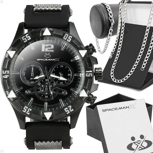 Relogio Masculino Preto + Cordão Prata Grumet + Pulseira Kit Especial Orizom Spaceman X para Presentear Quem Você Ama!! O kit exclusivo é perfeito para surpreender aquela pessoa especial em sua vida. Composto por: