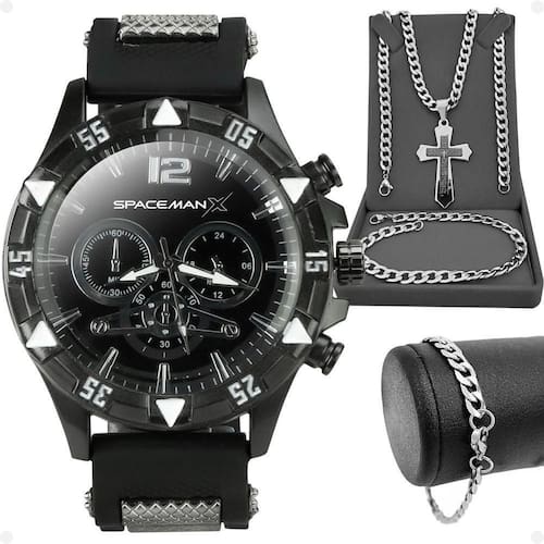 Relogio Masculino Preto + Pulseira + Cordão Prata Grumet Inoxidável Qualidade Premium Black Piano Kit Especial Orizom Spaceman X para Presentear Quem Você Ama! Surpreenda aquela pessoa especial em sua vida com este kit exclusivo, composto por:
