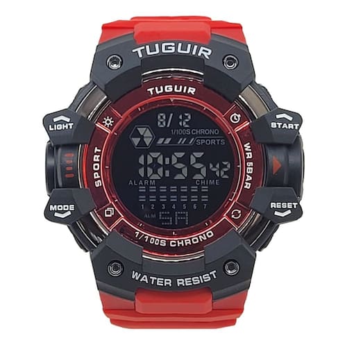 Marca: Tuguir Categoria: Digital Analógico: Não Digital: Sim (1 Horário) Calendário: Sim Despertador: Sim Mostra o Dia da Semana: Sim Mostra o Dia do Mês: Sim Cronômetro: Sim Luz: Sim Cor da Iluminação: Azul Resistente à Água: 5 ATM - Respingos: Sim - Chuva: Sim - Lavar Carro: Sim - Lavar Louça: Sim - Natação: Sim - Mergulho: Não Característica do Vidro: Acrílico Tipo de Fecho: Fivela Cor da Caixa: Preto Material da Caixa: Plástico Formato da Caixa: Redondo Diâmetro da Caixa: 54,00 (mm) Espessura da Caixa: 18,00 (mm) Cor da Pulseira: vermelho Material da Pulseira: Borracha Largura da Pulseira: 22,00 (mm) Comprimento Máximo da Pulseira: 250,00 (mm) Alimentação: Bateria Interna Peso Líquido: 0,070 Kg Modelo: TG30402 Cor Predominante: Vermelho Cor Diferencial: Preto Garantia: 12 Meses