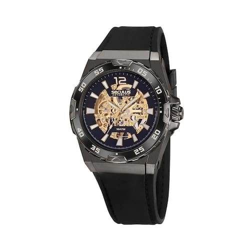 Relógio Masculino Seculus 20847Gpsvsu1 Com design diferenciado, este relógio tem como destaque seu mostrador transparente com todo o mecanismo à mostra. É um relógio com movimento automático, possui caixa de aço e visual preto com mecanismo dourado. Sua pulseira é feita de silicone, oferece um conforto confortável ao pulso. Especificações: Resistência à água: 100 Metros Medida de Caixa: 45 mm Material do Vidro: Cristal Mineral Funcionamento; Movimento Gênero: Masculino Garantia do Fabricante: 02 dois anos Material da Caixa: Aço Material da Pulseira: Silicone Ean: 7893689968869