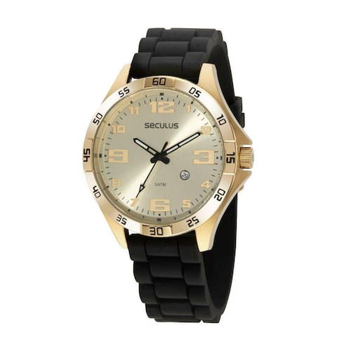 Relógio masculino seculus analógico dourado 44031gpsvdu2 Descrição do produtoEsportivo, este relógio analógico com calendário é o que faltava para um visual charmoso. Possui caixa em aço com folheação dourada, mostrador com lupa no calendário e numeração completa, facilitando a visualização das horas. Sua pulseira é de silicone super confortável para o pulso. Tamanho do vidro 36 mmTamanho da caixa 48mmComprimento do relógio cm 24Altura mm 13 mmLargura da pulseira mm 22 mmNúmero elos removíveis 0Atm - pressão máxima 5 atmAlarme nãoGarantia 2 anosEstilo esportivoColeção outrosFunção analogico com calendarioBanho douradoMateriais da pulseira siliconeMateriais da caixa açoCor da pulseira pretoGênero masculino