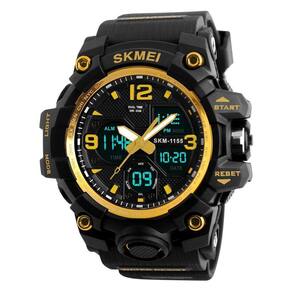 Relógio Skmei 100% original Marca: Skmei Modelo: 1155B Digital: Sim Horário: Duplo Horário Mostra o dia da semana: Sim Mostra o dia do mês: Sim Despertador: Sim Cronômetro: Sim Luz: Sim A prova d'água: Sim ( 5ATM - 50 Metros) - Respingos: Sim - Chuva: Sim - Lavar o carro: Sim - Natação: Sim Tipo de feche: Fivela Cor da pulseira: Preta Característica do vidro: Cristal Mineral Diâmetro da caixa do relógio (aprox.): 5 cm Comprimento Máximo (aprox.): 24,5 cm Largura da pulseira (aprox.): 23 mm Peso líquido (aprox.): 100g Formato: Redondo Alimentação: Bateria