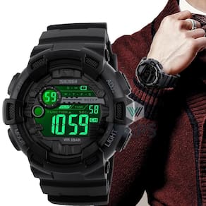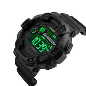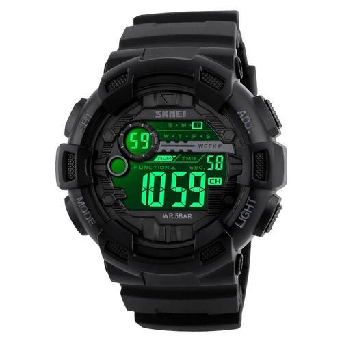 Relógio Masculino Skmei 1243 Esportivo Digital Prova D'água Cor: Preto Relógio Masculino Skmei 1243 Esportivo Digital Militar Prova D'água Led Multifuncional Características: Marca: Skmei Modelo: 1243 Categoria: Digital 2 Horários Formato da hora: 12/24 Despertador: Sim Bip de hora em hora: Sim Calendário: Sim Mostra o Dia da Semana: Sim Mostra o Dia do Mês: Sim Cronômetro: Sim Cronômetro Regressivo timer : Sim Luz: Sim Cor da Iluminação: Verde Resistente à Água: 5BAR/5ATM/50M Pode ser Utilizado para nadar no raso, por pouco tempo submerso - Respingos: Sim - Chuva: Sim - Lavar Louça: Sim - Natação: Sim - Mergulho: Não Característica do Vidro: Acrílico Tipo de Fecho: Fivela Simples Material da Caixa: Plástico Material da Pulseira: Borracha Formato da Caixa: Redondo Diâmetro da Caixa: 50 mm Espessura da Caixa: 17.4 mm Largura da Pulseira: 19.6 mm Comprimento Máximo da pulseira: 220 mm Alimentação: Bateria Peso Líquido: 56g : 03 Meses Conteúdo da Embalagem: - Relógio - Estojo do relógio -