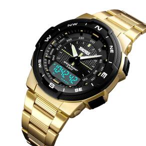 Relógio Masculino Skmei AnaDigi 1370 Dourado e Preto Relógio Masculino Skmei AnaDigi 1370 Dourado e Preto Marca: Skmei Categoria: AnaDigi ógico: Sim 1 Horário Ponteiros Fluorescentes: Sim Digital: Sim 1 Horário Calendário: Sim Despertador: Sim Mostra o Dia da Semana: Sim Mostra o Dia do Mês: Sim Cronômetro: Sim Contador Regressivo: Não Luz: Sim Cor da Iluminação: Azul Resistente à Água: 5 ATM Pode ser para nadar no raso, por pouco tempo submerso - Respingos: Sim - Chuva: Sim - Lavar Carro: Sim - Lavar Louça: Sim - Natação: Sim - Mergulho: Não Característica do Vidro: Acrílico Tipo de Fecho: Dobrável com Botão Cor da Caixa: Preto Material da Caixa: Metal Banho IP Formato da Caixa: Redondo Diâmetro da Caixa: 44,50 mm Espessura da Caixa: 14,00 mm Cor da Pulseira: Dourado Material da Pulseira: Metal Largura da Pulseira: 18,00 mm Comprimento Máximo da Pulseira: 240,00 mm Alimentação: Bateria Interna Peso Líquido: 0,095 Kg Modelo: 1370 Cor Predominante: Dourado Cor Diferencial: Preto : 12 Meses Conteúdo da Embalagem: 01 Relógio 01 Embalagem 01 Termo de Marca: Não Informado
