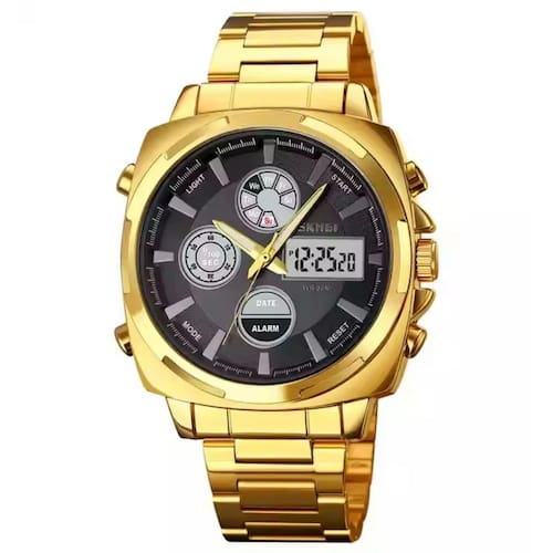 Relógio Masculino Skmei AnaDigi 1673G Dourado Relógio Masculino Skmei AnaDigi 1673G Dourado Marca: Skmei Categoria: AnaDigi Analógico: Sim 1 Horário Ponteiros Fluorescentes: Selecione Digital: Sim 1 Horário Calendário: Sim Despertador: Sim Mostra o Dia da Semana: Sim Mostra o Dia do Mês: Sim Cronômetro: Sim Luz: Sim Cor da Iluminação: Verde Resistente à Água: 3 ATM Resiste a imersões breves - Respingos: Sim - Chuva: Sim - Lavar Carro: Sim - Lavar Louça: Sim - Natação: Não - Mergulho: Não Característica do Vidro: Cristal Mineral Tipo de Fecho: Dobrável com Botão Cor da Caixa: Dourado Material da Caixa: Metal Banho IP Formato da Caixa: Redondo Diâmetro da Caixa: 44,00 mm Espessura da Caixa: 16,00 mm Cor da Pulseira: Dourado Material da Pulseira: Aço Largura da Pulseira: 21,00 mm Comprimento Máximo da Pulseira: 270,00 mm Alimentação: Bateria Interna Peso Líquido: 0,140 Kg Modelo: 1673G Cor Predominante: Dourado : 12 Meses Conteúdo da Embalagem: 01 Relógio 01 Embalagem 01 Termo de Marca: Não Informado Ean: 7891368320151