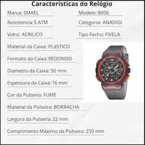 Marca: Smael Categoria: AnaDigi Analógico: Sim (1 Horário) Ponteiros Fluorescentes: Não Digital: Sim (1 Horário) Calendário: Sim Despertador: Sim Mostra o Dia da Semana: Sim Mostra o Dia do Mês: Sim Cronômetro: Sim Contador Regressivo: Não Luz: Sim Cor da Iluminação: Verde Resistente à Água: 5 ATM - Respingos: Sim - Chuva: Sim - Lavar Carro: Sim - Lavar Louça: Sim - Natação: Sim - Mergulho: Não Característica do Vidro: Acrílico Tipo de Fecho: Fivela Cor da Caixa: Fume Material da Caixa: Plástico Formato da Caixa: Redondo Diâmetro da Caixa: 50,00 (mm) Espessura da Caixa: 16,00 (mm) Cor da Pulseira: Fume Material da Pulseira: Borracha Largura da Pulseira: 22,00 (mm) Comprimento Máximo da Pulseira: 250,00 (mm) Alimentação: Bateria Interna Peso Líquido: 0,055 Kg Modelo: 8006 Cor Predominante: Fume Cor Diferencial: Laranja Garantia: 12 Meses