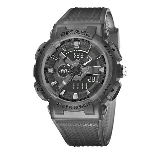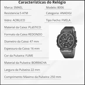Marca: Smael Categoria: AnaDigi Analógico: Sim (1 Horário) Ponteiros Fluorescentes: Não Digital: Sim (1 Horário) Calendário: Sim Despertador: Sim Mostra o Dia da Semana: Sim Mostra o Dia do Mês: Sim Cronômetro: Sim Contador Regressivo: Não Luz: Sim Cor da Iluminação: Verde Resistente à Água: 5 ATM - Respingos: Sim - Chuva: Sim - Lavar Carro: Sim - Lavar Louça: Sim - Natação: Sim - Mergulho: Não Característica do Vidro: Acrílico Tipo de Fecho: Fivela Cor da Caixa: Fume Material da Caixa: Plástico Formato da Caixa: Redondo Diâmetro da Caixa: 47,00 (mm) Espessura da Caixa: 16,00 (mm) Cor da Pulseira: Fume Material da Pulseira: Borracha Largura da Pulseira: 22,00 (mm) Comprimento Máximo da Pulseira: 250,00 (mm) Alimentação: Bateria Interna Peso Líquido: 0,060 Kg Modelo: 8006 Cor Predominante: Fume Garantia: 12 Meses