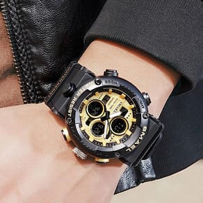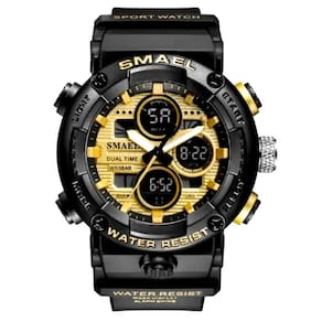 Relógio Masculino Smael AnaDigi 8038 Preto e Dourado Marca: Smael Categoria: AnaDigi ógico: Sim 1 Horário Ponteiros Fluorescentes: Sim Digital: Sim 1 Horário Calendário: Sim Despertador: Sim Mostra o Dia da Semana: Sim Mostra o Dia do Mês: Sim Cronômetro: Sim Luz: Sim Cor da Iluminação: Verde Resistente à Água: 5 ATM Pode ser para nadar no raso, por pouco tempo submerso - Respingos: Sim - Chuva: Sim - Lavar Carro: Sim - Lavar Louça: Sim - Natação: Sim - Mergulho: Não Característica do Vidro: Acrílico Tipo de Fecho: Fivela Cor da Caixa: Preto Material da Caixa: Plástico Formato da Caixa: Redondo Diâmetro da Caixa: 48,30 mm Espessura da Caixa: 17,00 mm Cor da Pulseira: Preto Material da Pulseira: Silicone Largura da Pulseira: 21,00 mm Comprimento Máximo da Pulseira: 240,00 mm Alimentação: Bateria Interna Peso Líquido: 0,065 Kg Modelo: 8038 Cor Predominante: Preto Cor Diferencial: Dourado : 12 Meses Conteúdo da Embalagem: 01 Relógio 01 Embalagem 01 Termo de Marca: Não Informado Ean: 7891368315065