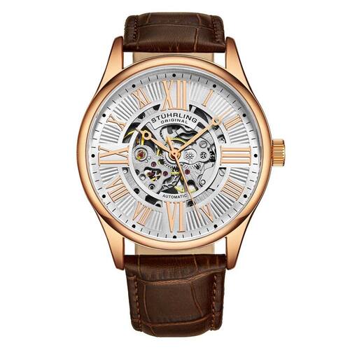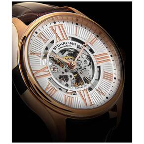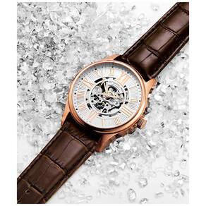 Caixa automática masculina rosa, ouro, bisel polido rosa, dourado, mostrador esqueletizado branco e prateado com tons de ouro e detalhes em vermelho, ponteiros em tons de rosa, ouro, marcadores em tons de rosa, ouro, relógio com pulseira de couro em relevo de crocodilo marrom