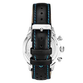 O poderoso movimento de quartzo japonês VK83 controla o submostrador de 24 horas e o atraente contador de cronógrafo retrógrado de 20 minutos.