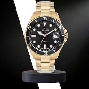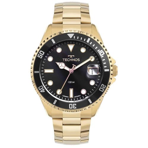 Relógio Masculino Technos Acqua Analógico 2415DW/1P Dourado A linha Acqua com o clássico design para mergulho. Ele possui elementos indispensáveis para aventuras submersas, como o aro externo giratório com acabamento corrugado e lente antireflexo com lupa de calendário, além do mostrador com ponteiros e marcadores de hora luminescentes. Seu mostrador ainda conta com um acabamento degradê colorido e formas geométricas nos marcadores de hora. Produto em aço inoxidável, com máquina quartz japonesa, calendário e resistência à água de até 15 ATM. Características:ean: 7891530824609Marca: TechnosModelo: 2415DW/1PCor da Caixa: DouradoCor da Pulseira: DouradoMaterial da Caixa: MetalMaterial da Pulseira: AçoCor do Mostrador: PretoResistência à água: 15 ATMMecanismo: AnalógicoFunções: Calendário com dataDimensões da Embalagem:Altura: 8cmLargura: 12cmProfundidade: 16cmPeso: 0,400KgGarantia: 12 Meses