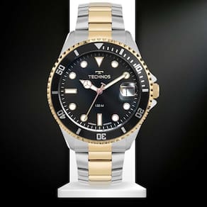 Relógio Masculino Technos Acqua Analógico 2415DX/1P Prata A linha Acqua com o clássico design para mergulho. Ele possui elementos indispensáveis para aventuras submersas, como o aro externo giratório com acabamento corrugado e lente antireflexo com lupa de calendário, além do mostrador com ponteiros e marcadores de hora luminescentes. Seu mostrador ainda conta com um acabamento degradê colorido e formas geométricas nos marcadores de hora. Produto em aço inoxidável, com máquina quartz japonesa, calendário e resistência à água de até 15 ATM. Características:ean: 7891530824616Marca: TechnosModelo: 2415DX/1PCor da Caixa: PrataCor da Pulseira: Dourado e prataMaterial da Caixa: MetalMaterial da Pulseira: AçoCor do Mostrador: PretoResistência à água: 15 ATMMecanismo: AnalógicoFunções: Calendário com dataDimensões da Embalagem:Altura: 8cmLargura: 12cmProfundidade: 16cmPeso: 0,400KgGarantia: 12 Meses
