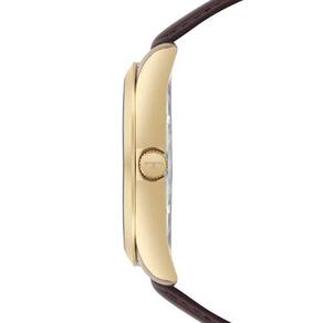 Este relógio foi confeccionado com material de primeiríssima qualidade, garantindo sua resistência e durabilidade. Sua caixa é feita em aço, na cor dourada, o que confere um toque de elegância ao acessório. A pulseira, por sua vez, é em couro na cor marrom, proporcionando conforto e estilo ao usuário.