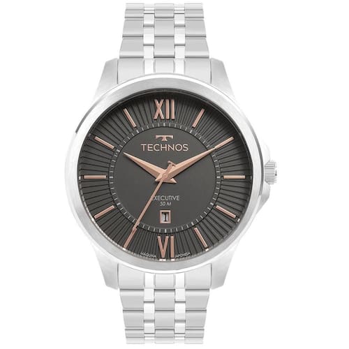 A coleção Executive apresenta um novo modelo elegante, com detalhes sutis e sofisticados na nova caixa. Seu mostrador clássico na cor grafite se destaca pela assinatura de linha, numeração romana e aplicação de textura discreta. Além disso, possui uma pulseira diferenciada de 5 links. Produto 100% em aço inoxidável, com máquina quartz Japonesa Miyota, calendário e resistência à água de 50m.