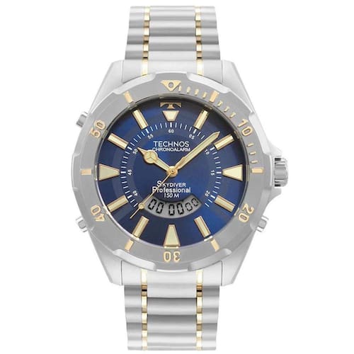 O Relógio Masculino Skydiver da Technos é o acessório perfeito para utilizar em qualquer ocasião. Com design moderno, é confeccionado em aço inoxidável e possui aro giratório com marcação em alto-relevo, combina com todos os estilos.O Relógio de Pulso Technos apresenta um display digital em forma de sorriso e lumi no mostrador de cor azul, acrescentando beleza e sofisticação à peça, ideal para presentear ou te acompanhar no dia-a-dia.Características:- Resistente a água- Possui alarme e luz noturna- Com mostrador analógico e digitalEspecificações Marca: Technos Modelo: WT2050AB/1AGênero: MasculinoTipo de mostrador: AnadigiMecanismo: QuartzoAlimentação: BateriaFormato da caixa: RedondoCor do mostrador: Azul Cor da caixa: Prata Cor da pulseira: Prata Material do vidro: Cristal mineralMaterial da caixa: MetalMaterial da pulseira: Aço Tipo de fecho: Trava por pressãoNível de resistência a água: 15 atmAlarme: SimLuz noturna: simLargura da caixa: 48 mm Sobre a TechnosFundada na Suíça em 1900, a Technos é referência internacional na produção de relógios para todos os gêneros e estilos. A marca oferece produtos com muita qualidade, tecnologia e inovação, sempre pensando na melhor experiência ao consumidor final.Aviso: Imagem meramente ilustrativa. Pode haver alteração da cor, conforme o seu monitor.
