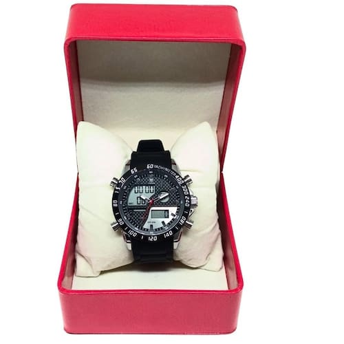 Relógio Masculino Tuguir AnaDigi 2308 Prata e Preto Relógio Masculino Tuguir AnaDigi 2308 Prata e Preto Marca: Tuguir Categoria: Digital Analógico: Não Digital: Sim 1 Horário Calendário: Sim Despertador: Sim Mostra o Dia da Semana: Sim Mostra o Dia do Mês: Sim Cronômetro: Sim Luz: Sim Cor da Iluminação: Verde Resistente à Água: 5 ATM Pode ser Utilizado para nadar no raso, por pouco tempo submerso - Respingos: Sim - Chuva: Sim - Lavar Carro: Sim - Lavar Louça: Sim - Natação: Sim - Mergulho: Não Característica do Vidro: Cristal Mineral Tipo de Fecho: Fivela Cor da Caixa: Prata Material da Caixa: Metal Banho IP Formato da Caixa: Redondo Diâmetro da Caixa: 45,00 mm Espessura da Caixa: 17,00 mm Cor da Pulseira: Preto Material da Pulseira: Borracha Largura da Pulseira: 23,50 mm Comprimento Máximo da Pulseira: 250,00 mm Alimentação: Bateria Interna Peso Líquido: 0,110 Kg Modelo: 2308 Cor Predominante: Prata Cor Diferencial: Preto : 12 Meses Conteúdo da Embalagem: 01 Relógio 01 Embalagem 01 Termo de Ean: 7891368318042