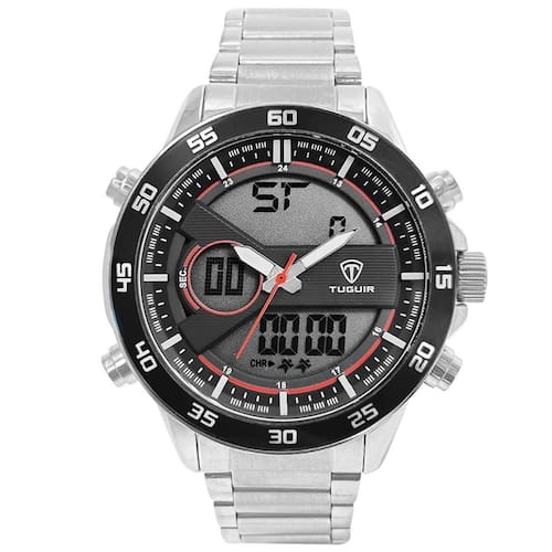 O Relógio Masculino Tuguir Anadigi Tg1161 Prata E Preto é perfeito para homens que buscam praticidade e estilo em um único acessório. Com um design moderno e sofisticado, ele combina perfeitamente com qualquer ocasião, seja no dia a dia ou em eventos especiais. Esse relógio possui um mostrador ógico com 1 horário e ponteiros fluorescentes, além de um mostrador digital também com 1 horário. Ele conta com diversas funções, como calendário, despertador, indicação do dia da semana e do dia do mês, cronômetro e luz de iluminação na cor verde. A resistência à água desse relógio é de 5 ATM, o que significa que ele pode ser para nadar no raso por pouco tempo submerso. Ele é resistente a respingos, chuva, lavagem de carro e louça, porém não é recomendado para mergulho. A caixa desse relógio é feita em metal banhado IP na cor prata, com um formato redondo e diâmetro de 46,00 mm. A pulseira é de aço na cor prata, com largura de 20,00 mm e comprimento máximo de 240,00 mm. O fecho é dobrável com botão, proporcionando um ajuste seguro e confortável no pulso. Esse relógio é alimentado por uma bateria interna e possui um peso líquido de 0,149 Kg. O modelo é KT1161, com a cor predominante em prata e a cor diferencial em preto. A é de 12 meses e a embalagem contém o relógio, a embalagem em si e o termo de . Com o Relógio Masculino Tuguir Anadigi Tg1161 Prata E Preto, você terá um acessório de qualidade, durabilidade e estilo. Marca: Não Informado