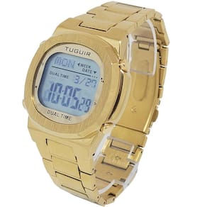 Relógio Masculino Tuguir Digital TG30324 Dourado Relógio Masculino Tuguir Digital TG30324 Dourado Marca: Tuguir Categoria: Digital Analógico: Não Digital: Sim 2 Horário Calendário: Sim Despertador: Sim Mostra o Dia da Semana: Sim Mostra o Dia do Mês: Sim Cronômetro: Sim Contador Regressivo: Sim Luz: Sim Cor da Iluminação: Resistente à Água: 3 ATM Resiste a imersões breves - Respingos: Sim - Chuva: Sim - Lavar Carro: Sim - Lavar Louça: Sim - Natação: Não - Mergulho: Não Característica do Vidro: Cristal Mineral Tipo de Fecho: Dobrável com Botão e Trava Cor da Caixa: Dourado Material da Caixa: Metal Banho IP Formato da Caixa: Redondo Diâmetro da Caixa: 42,00 mm Espessura da Caixa: 10,50 mm Cor da Pulseira: Dourado Material da Pulseira: Aço Largura da Pulseira: 17,00 mm Comprimento Máximo da Pulseira: 210,00 mm Alimentação: Bateria Interna Peso Líquido: 0,100 Kg Modelo: TG30324 Cor Predominante: Dourado Garantia: 12 Meses